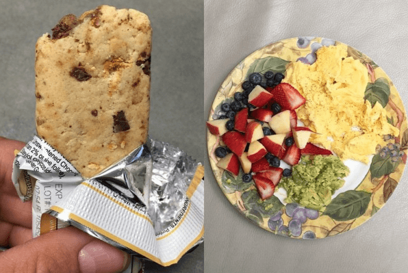 Below is a photo of some scrambled egg beaters, fruit salad, and avocado coming to a total weight of 450g compared to a quest bar that is 60g in weight.