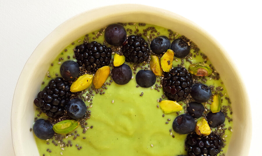 Try freezing green apple, kiwi, blueberries, a fistful of spinach and cucumber and then blend them into your desired consistency. Frozen fruit and vegetables work best for consistency. You can add protein powder, too!
